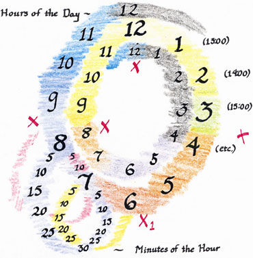 1. I link the calendar, i.e. Days, months, years and centuries with colour. The weeks and years are circular while the centuries are parallel and the years run bottom to top.